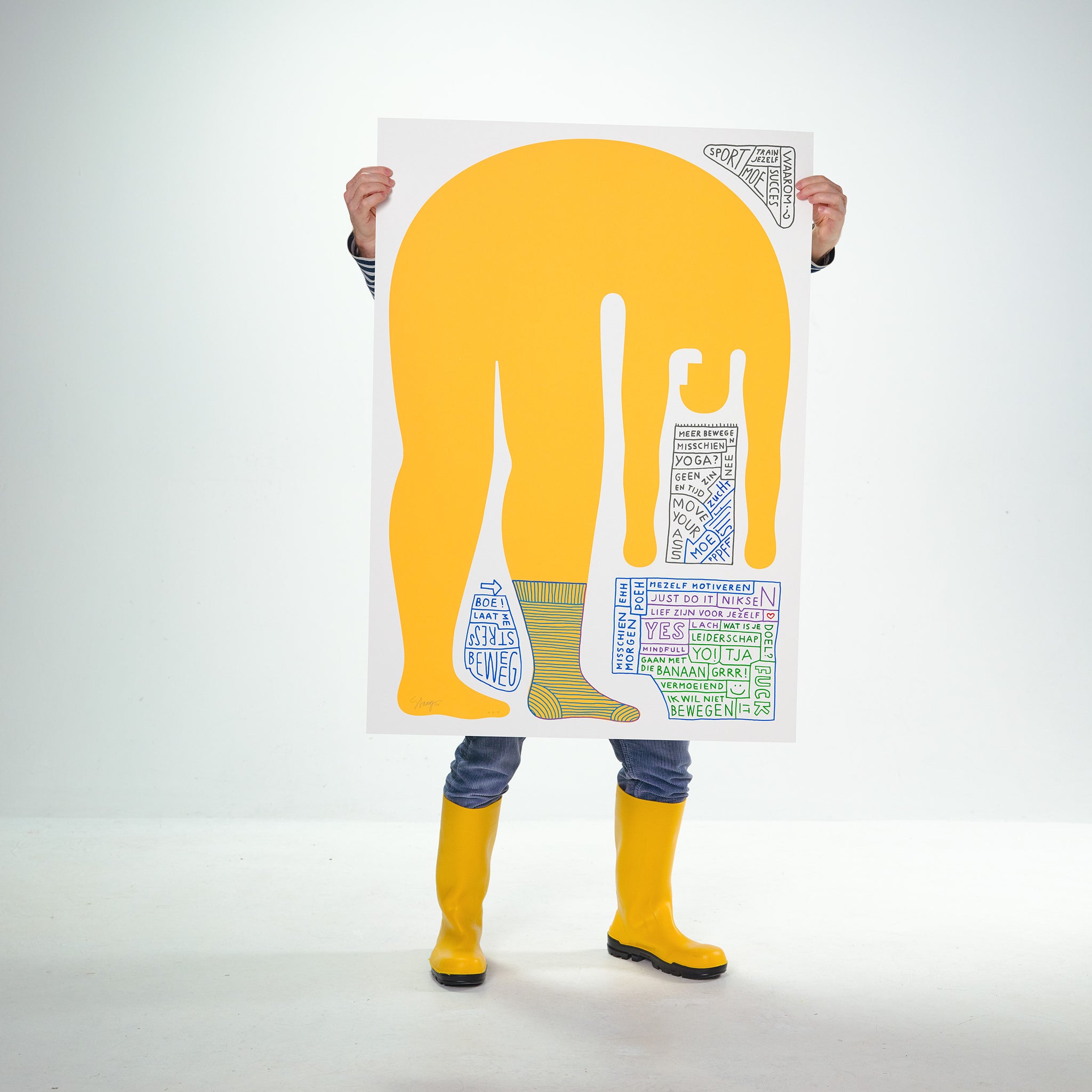 Speciale editie zeefdruk ★ Hij moest meer bewegen, geel op A0 formaat (84,1 x 118,9 cm), één uit een serie van allemaal met de hand bewerkte en unieke exemplaren met stempels, plakfolie, spuitbus, tekstjes, potlood, verf, quotes.